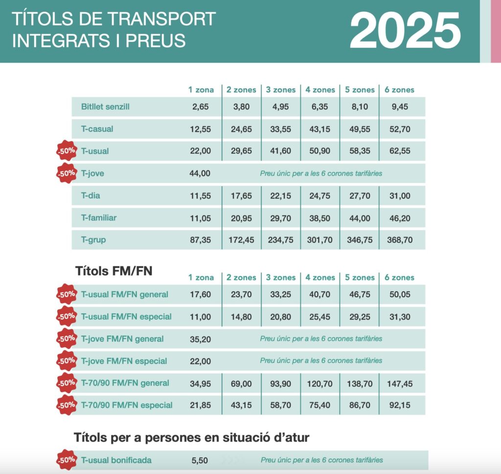 A partir de mañana, miércoles 15 de enero de 2025, entran en vigor las nuevas tarifas del transporte público, que experimentan un incremento del 3%. A pesar de la subida, se mantendrán los descuentos del 50% en los abonos T-usual y T-jove, medidas que benefician especialmente a los usuarios frecuentes y a los jóvenes.