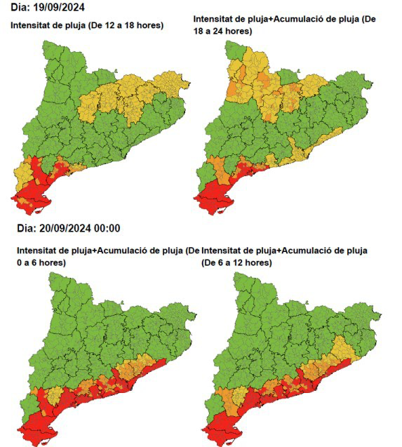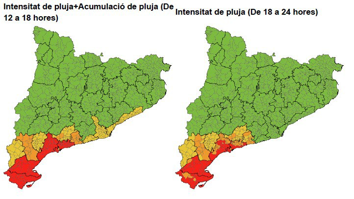 Las previsiones del Servicio Meteorológico de Catalunya (SMC) indican que a partir de hoy por la tarde/noche y el viernes por la noche se espera un episodio de intensas lluvias en el litoral y prelitoral sur y centro, especialmente en las comarcas del Baix Camp, Baix Ebre, Baix Llobregat, Baix Penedès, Barcelonés, Garraf, Maresme, Montsià y Tarragonès y en menor probabilidad por la noche también puede afectar a la zona del Pirineo occidental.