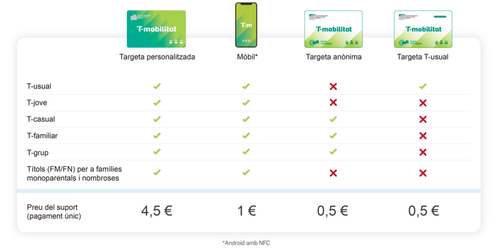 A partir de ahora, los títulos integrados T-usual, T-casual, T-grup y T-familiar sólo estarán disponibles con la T-mobilitat. Las máquinas expendedoras de las estaciones sólo imprimirán, de forma progresiva, tarjetas T‑mobilitat en cartón, recargables, con tecnología sin contacto y anónimas, es decir, sin registro previo.