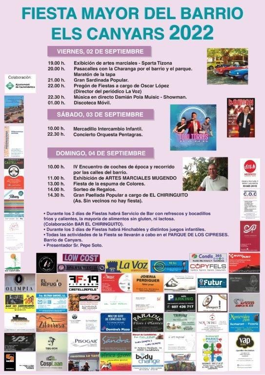 Actuaciones musicales, actividades para los más pequeños y propuestas gastronómicas de carácter popular con una paella y una sardinada conforman el grueso de actos del programa de este año de la fiesta del barrio de Canyars. Recordemos que esta es la última de las fiestas de barrio del verano 2022 en Castelldefels. Las actividades las organiza la asociación de vecinos del barrio con el apoyo del Ayuntamiento de Castelldefels.