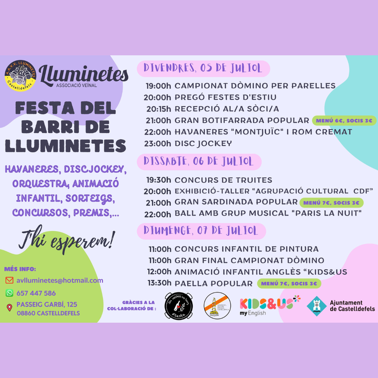 Lluminetes celebra del 5 al 7 de julio sus fiestas populares con una amplia propuesta de actividades lúdicas, musicales, familiares y gastronómicas organizadas por la asociación vecinal del barrio con la colaboración del Ayuntamiento de Castelldefels.