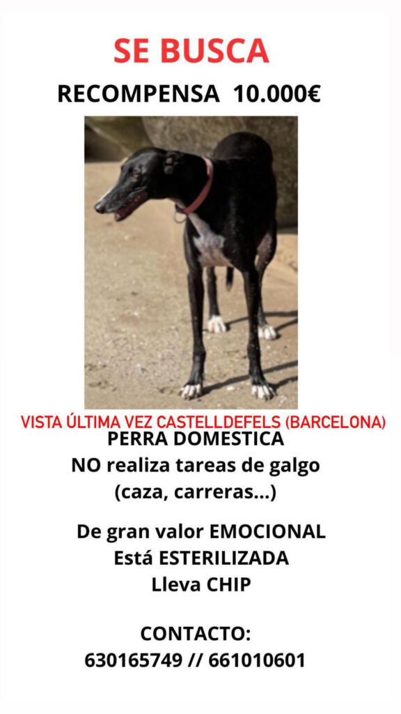 La galga está castrada y es doméstica, no realiza tareas de galgo (caza, carreras, etc), lleva chip y está esterilizada. Para su familia es de gran valor emocional y su recompensa por traerla de vuelta a casa no está dejando indiferente a nadie: 10.000 euros.