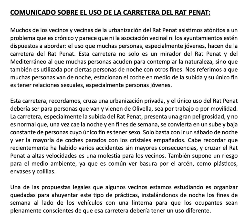 Los residentes de la urbanización del Rat Penat han manifestado su creciente preocupación por el uso de la carretera de subida del Rat Penat, especialmente durante las noches de los fines de semana. Según un comunicado que se ha difundido por varias redes sociales, los vecinos denuncian que la vía se ha convertido en un punto de encuentro para parejas, especialmente jóvenes, que la utilizan con el único fin de tener relaciones sexuales.
